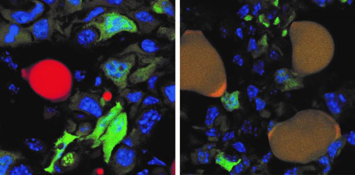 Na slici iznad prikazan je ovaj postupak, sa ćelijama raka označenim zelenim fluorescentnim proteinom i normalnim crvenim masnim ćelijama sa leve strane.Masne ćelije koje su pretvorene u rak prikazuju se kao smeđe (s desne strane), jer se crvena masna ćelija kombiniovala sa zelenom oznakom proteina ćelija raka